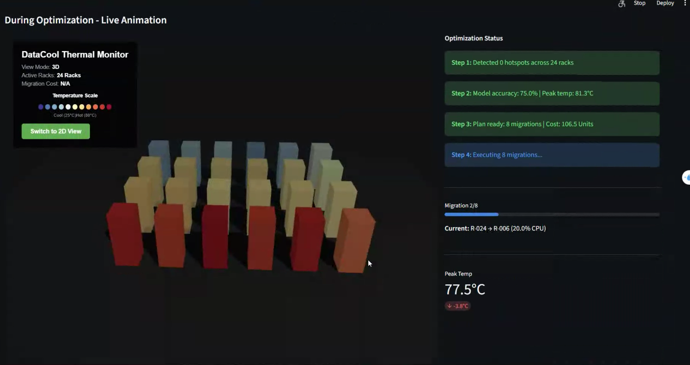 Built a machine learning system using Histogram Gradient Boosting to predict hotspots with 94% accuracy. Implemented constraint-based optimization for workload redistribution with thermal physics modeling.